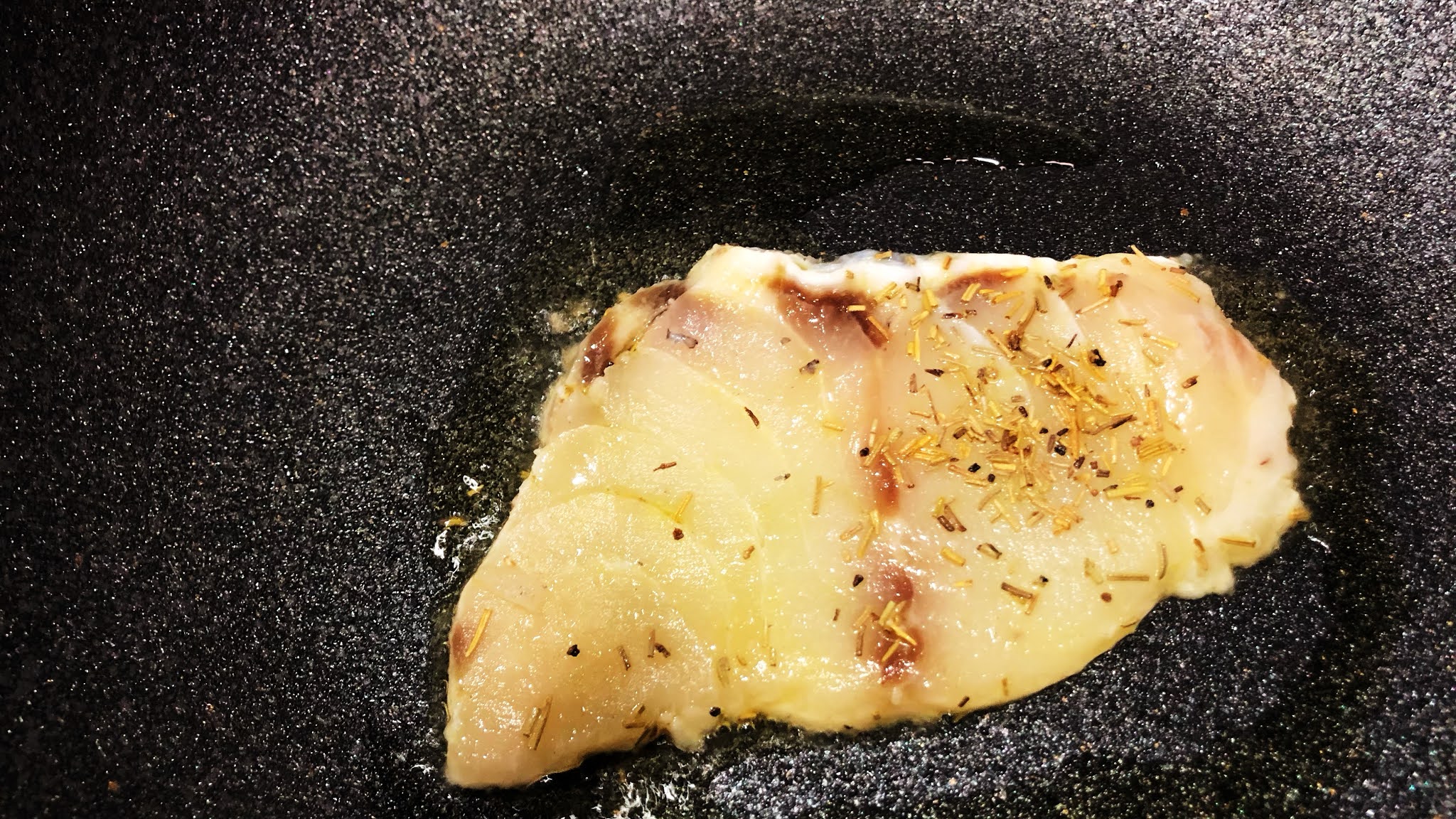 第二道嫩煎魚排,用橄欖油均勻塗抹在魚肉上,撒上七里香浸置5-10分鐘。讓香料藉著橄欖油慢慢滲入魚肉中,屬於清爽的醃漬方式。