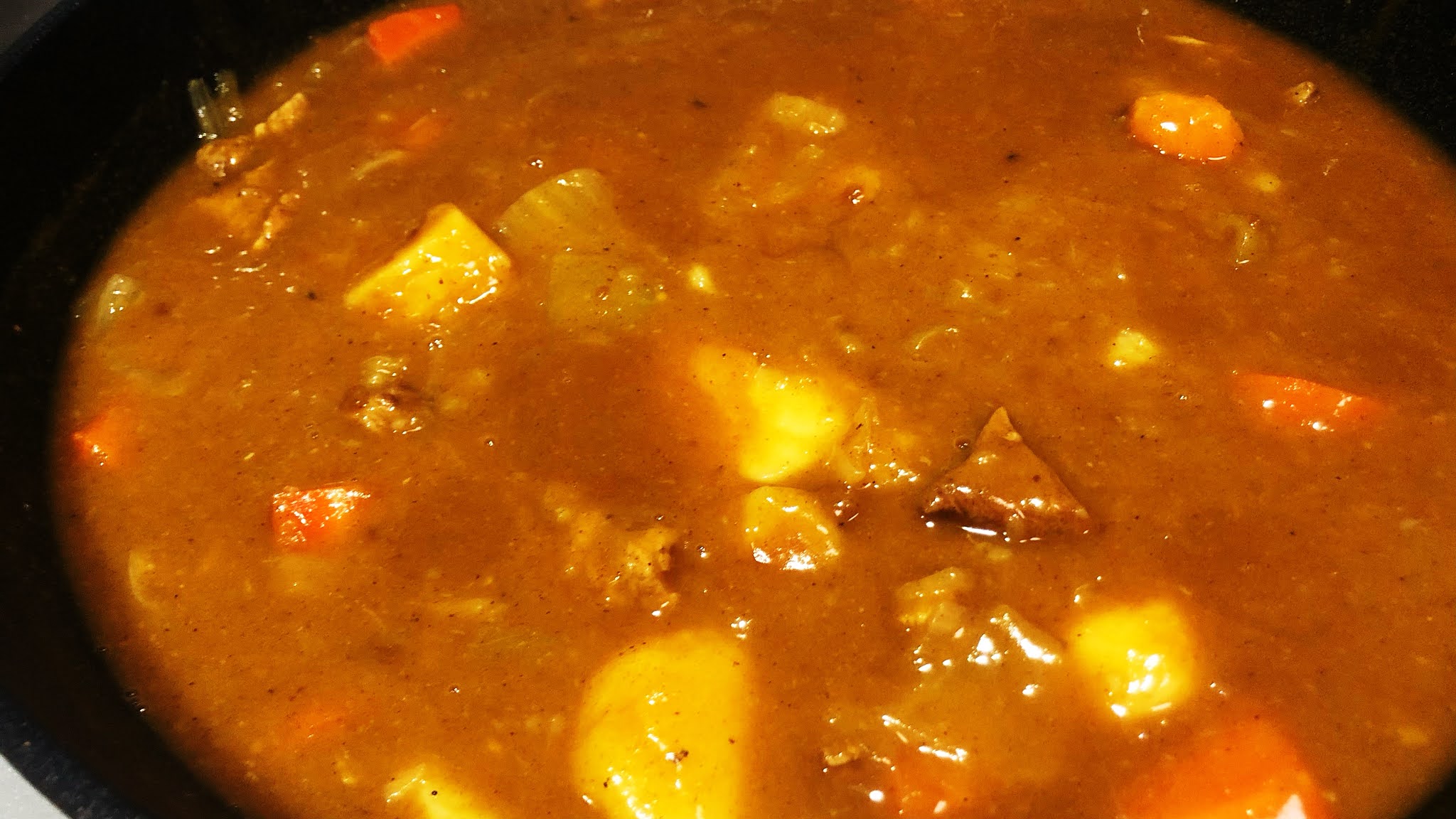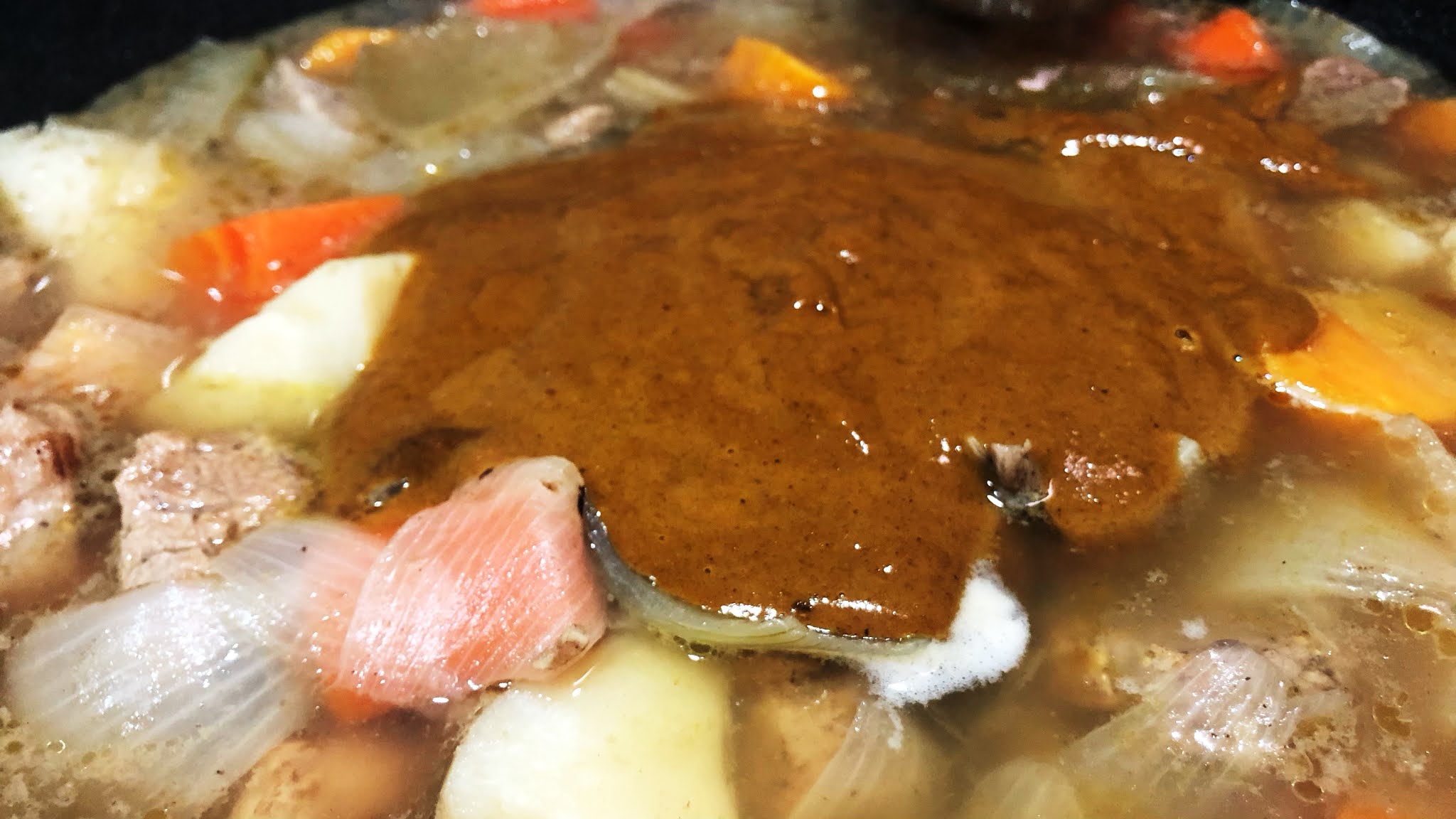 6.用燉煮好的湯頭混合咖哩塊,讓咖哩塊完全溶解。