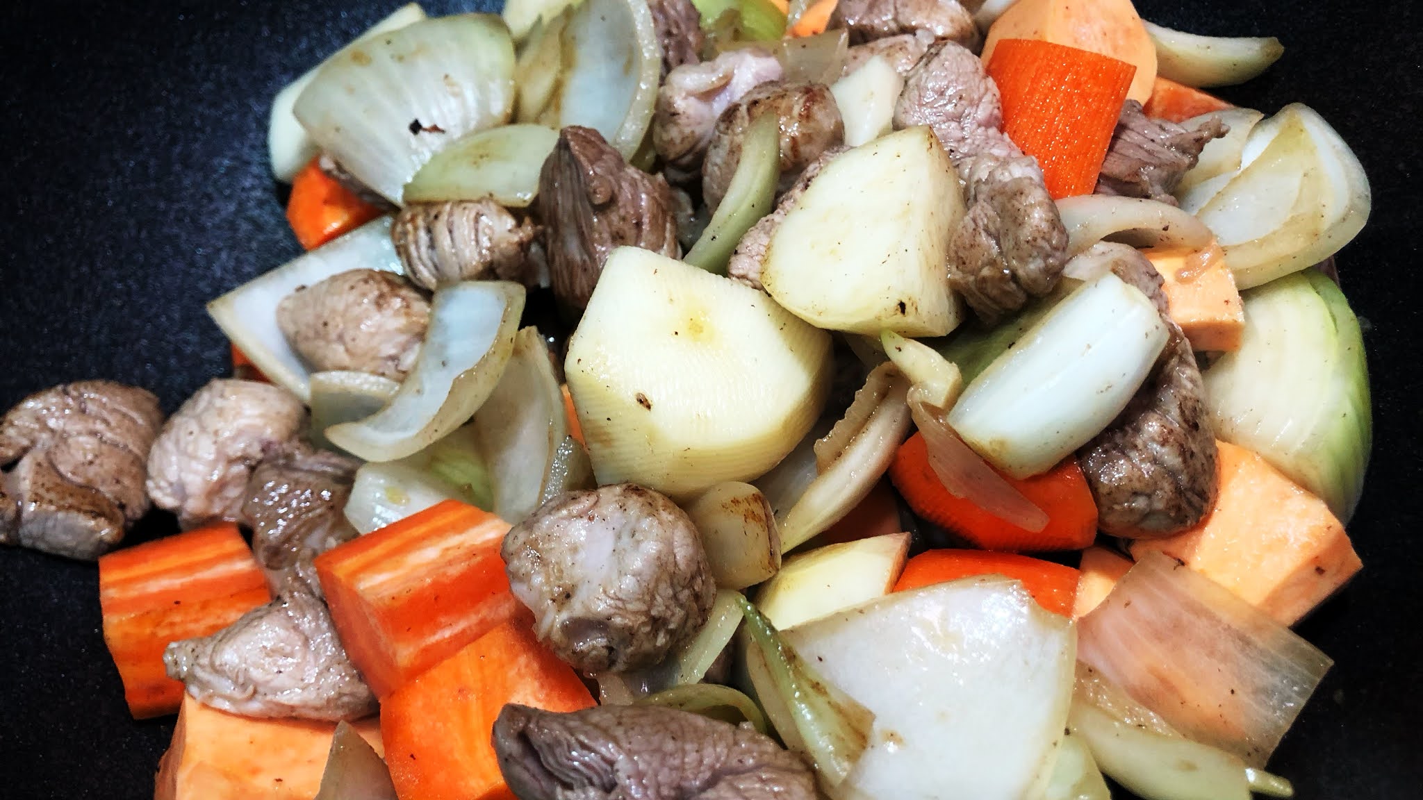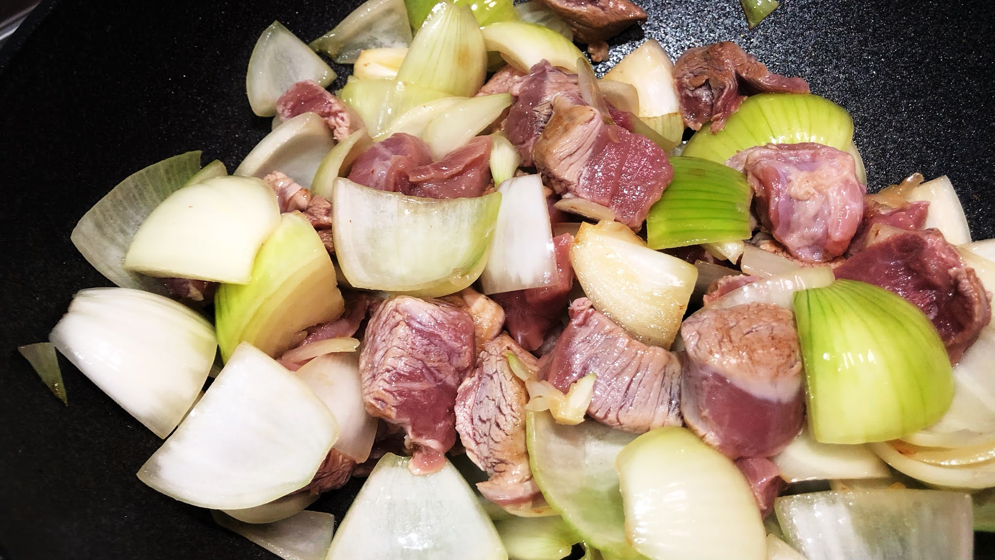 2.洋蔥微微變色後,將肉塊放入鍋中一起拌炒,稍微把肉表皮煎炒到金黃。